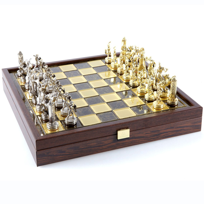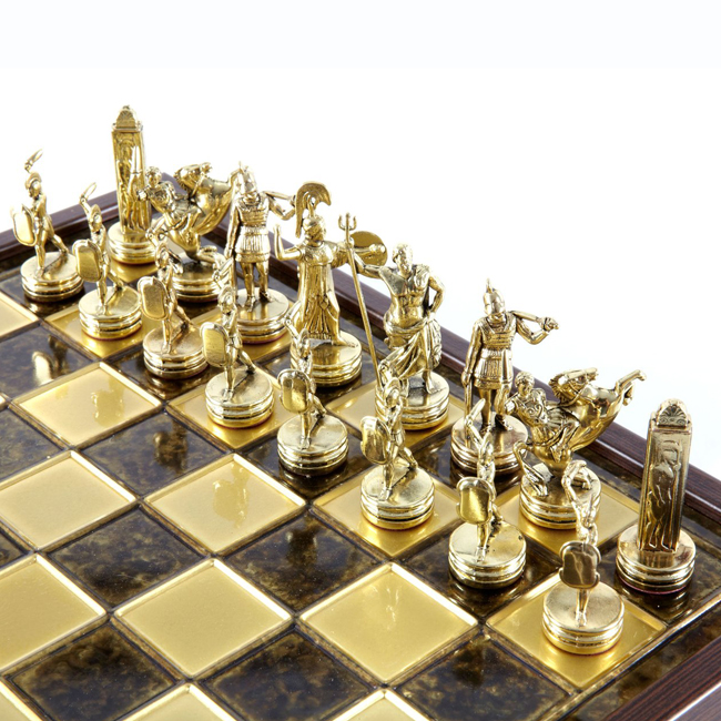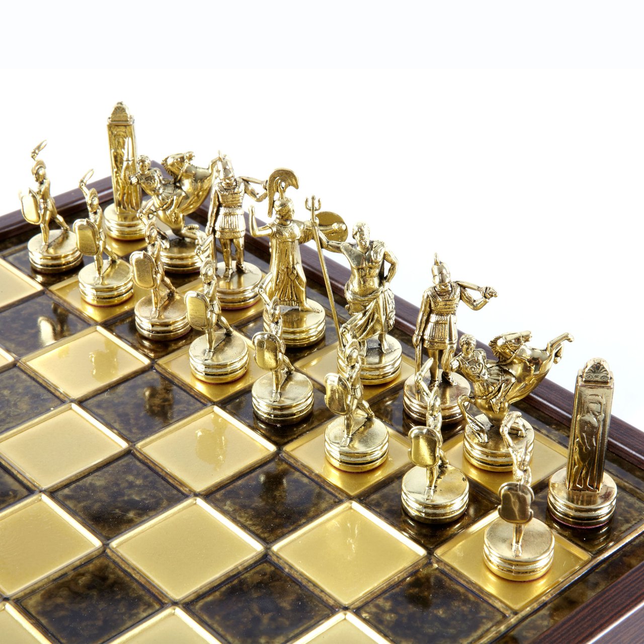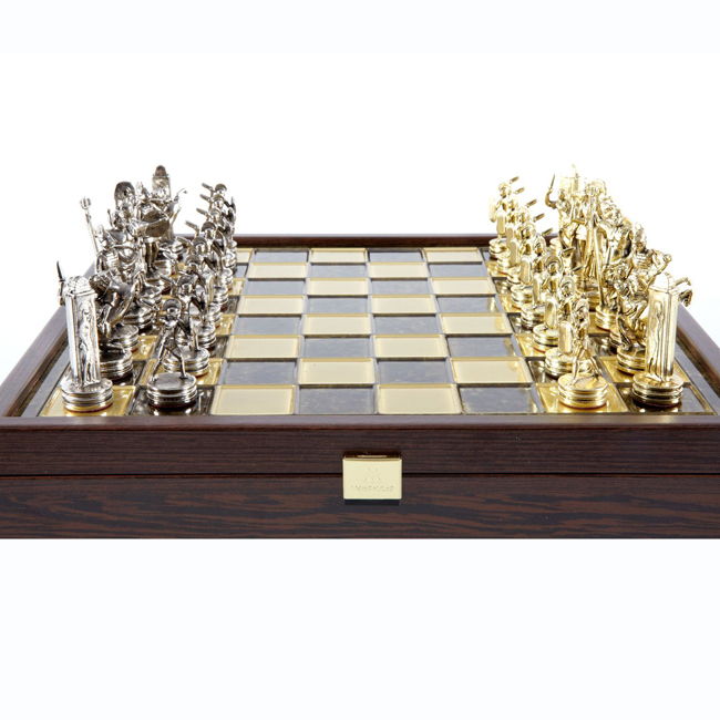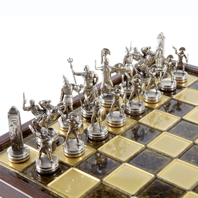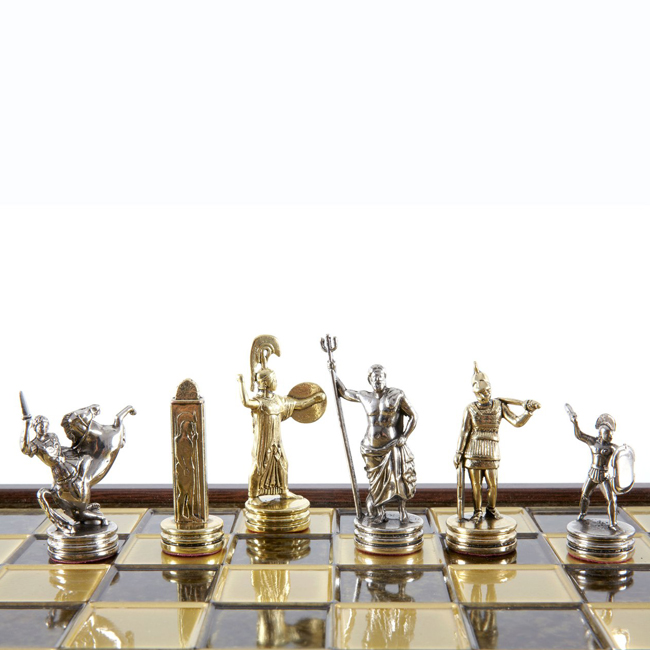 Гръцките скулптори обичали да пресъздават конфликта на боговете от древните легенди чрез своето изкуство. Царят в този шах е реплика на известната статуя Посейдон от Мелос (II в. Пр.н.е.), а царицата представлява славната Атина Промахос (450 г. пр. Хр., Музей на Акропола). Бронзова елинистична статуя е вдъхновила офицера, а конят е част от мраморната фасада на Партенона, изваяна от Федий. Топът е репродукция на една от най-възхитителните атически стели, посветена на загиналия в битка млад Арис. Пешката е бронзова статуя на напълно въоръжен воин от 500 г. пр.н.е.