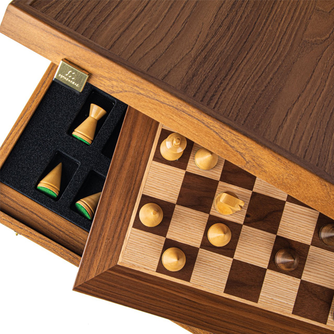 Комплектът включва шахматна дъска от перфектно подбрани орехови и дъбови фурнири.