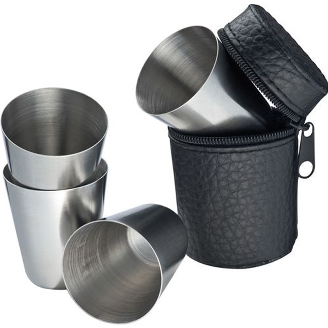 • Комплект от 4 малки чаши за алкохол, изработени от неръждаема стомана в стилен и практичен калъф.