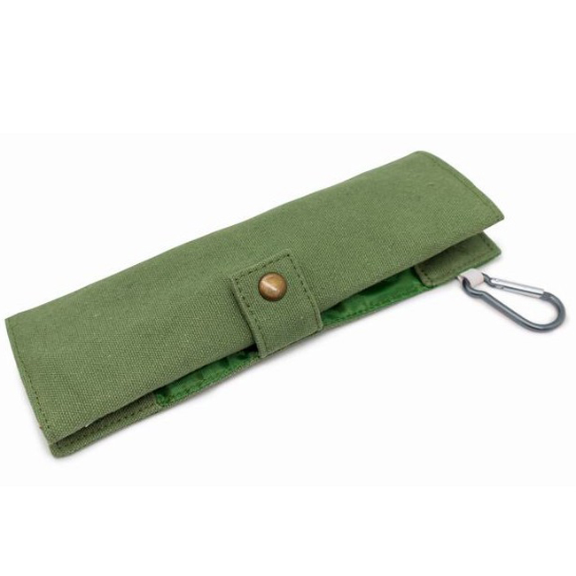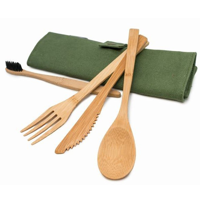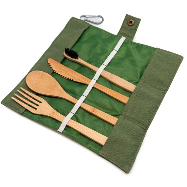 Преносим комплект от 100% бамбукови прибори за хранене, състоящ се от нож, вилица, лъжица и четка за зъби. Комплектът се съхранява защитен в текстилен калъф за лесно, удобно и хигиенично пренасяне.