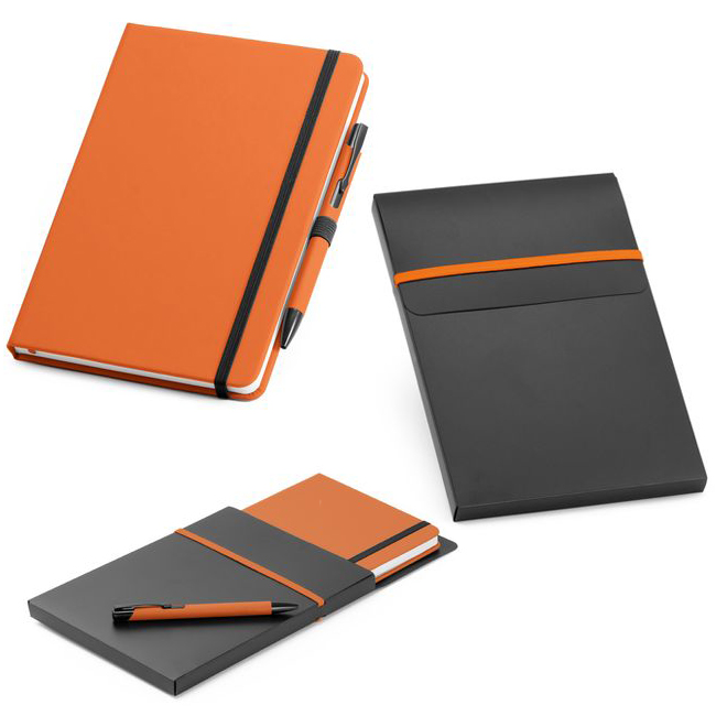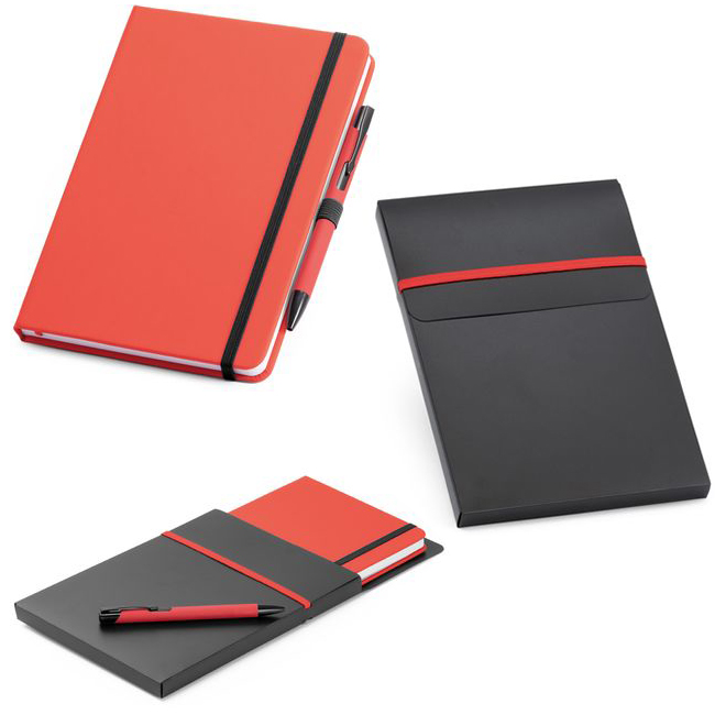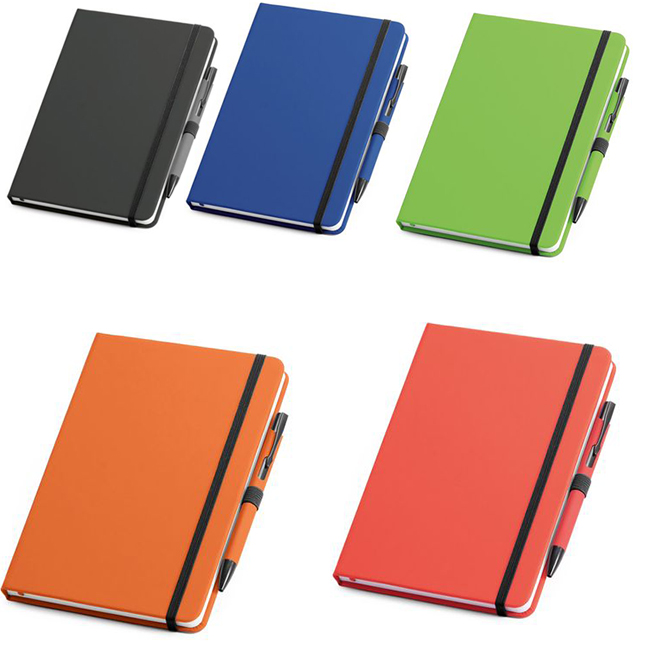 - Рекламен бележник с цветни твърди корици и химикалка. Бележникът е с размер А5