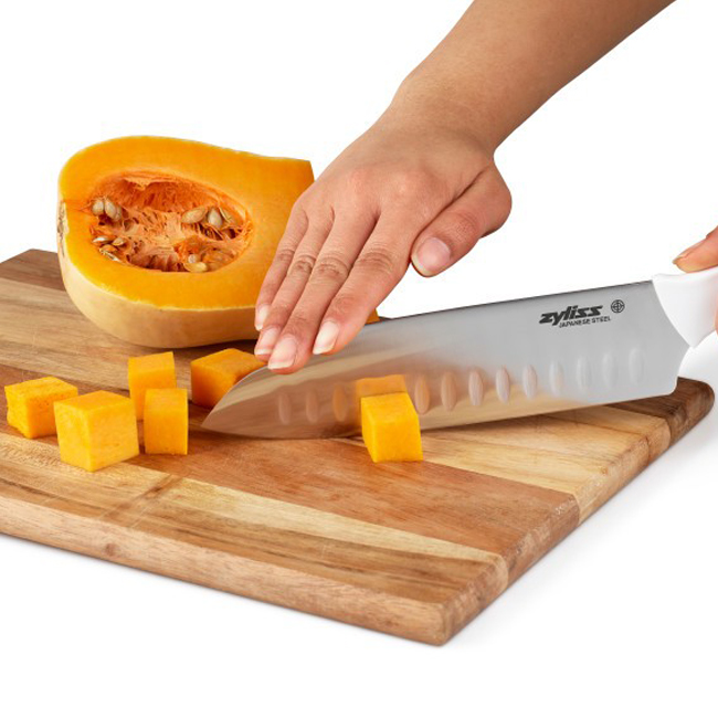 Ножът Santoku от серията Comfort на Zyliss има вдлъбнатини по цялата дължина на острието, които не позволяват на храната да залепва по него. Специално е разработен за продукти, които са трудни за рязане. Здравото острие от японска стомана ще разреже с лекота всякакви твърди зеленчуци.