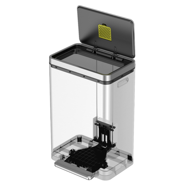 Кошовете за отпадъци X-CUBE са изработени от неръждаема стомана, имат покритие срещу пръстови отпечатъци и антибактериално покритие от нано сребро. Силиконовият уплътнителен пръстен гарантира, че неприятните миризми ефективно се задържат в кошчето за отпадъци. В капака има и вграден филтър за миризма.