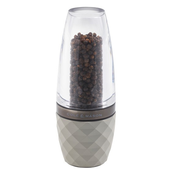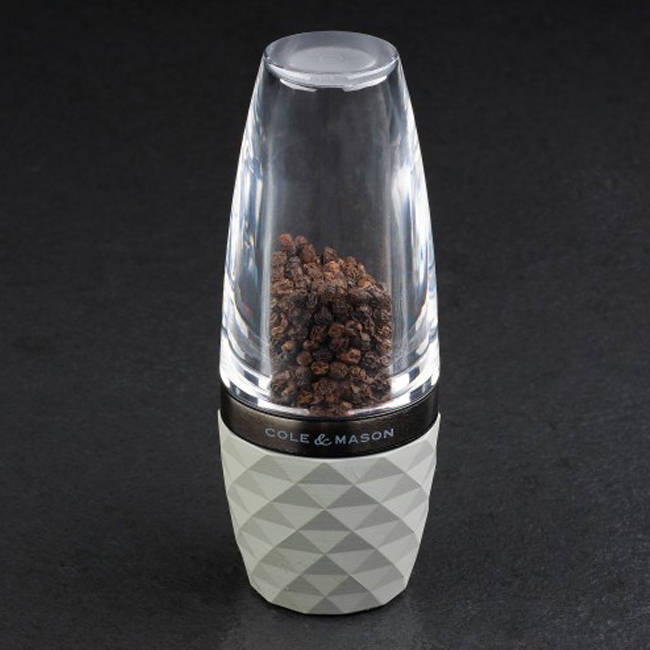 Стилна и съвременна мелница за пипер, вдъхновена от градската британска архитектура. Без усилие съчетава изчистената красота и семплия вид на камъка, като същевременно остават безценен всекидневен кухненски аксесоар. Опростената форма на прозрачния акрилен контейнер е проектирана да контрастира с геометрично оформения каменен фундамент. Структурата и мотива на камъка създават мелница, която Ви насърчава да я вземете и да я използвате при всяка възможност.