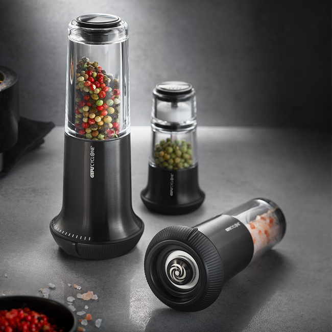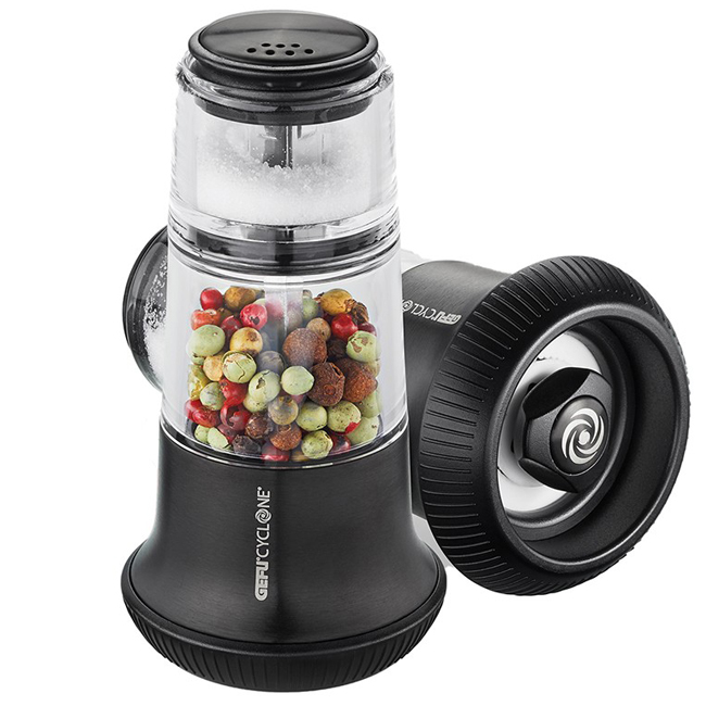 Горната част на мелницата е с вградена солница. Мелницата за пипер е снабдена с прецизен смилащ механизъм CYCLONE®