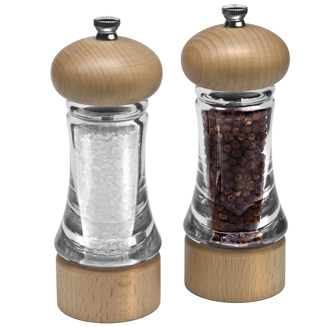 Комплект мелнички за сол и черен пипер с класически, но съвременен дизайн, съчетаващи модерни и традиционни материали. Комбинацията от прозрачно акрилно тяло и класически детайли от дърво придават стил на всяка кухня, като същевременно оставят мелничките ежедневен аксесоар.