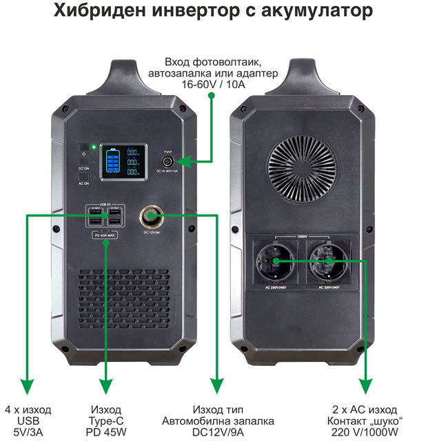 За разлика от други електроцентрали с малък капацитет, това хибридно устройство може да захранва електроуреди с по-голяма мощност като електрическа бормашина, сешоар, блендер (уверете се, че максималната мощност на Вашия уред е не повече от 1000W).
