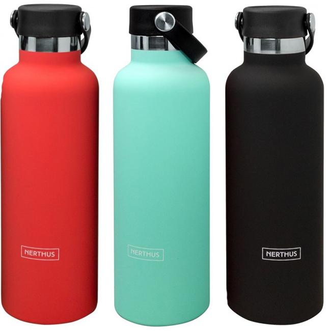 Двустенната спортна бутилка от неръждаема стомана на Nerthus дава възможност да се поддържа температурата на консумация на топли и студени напитки за няколко часа.