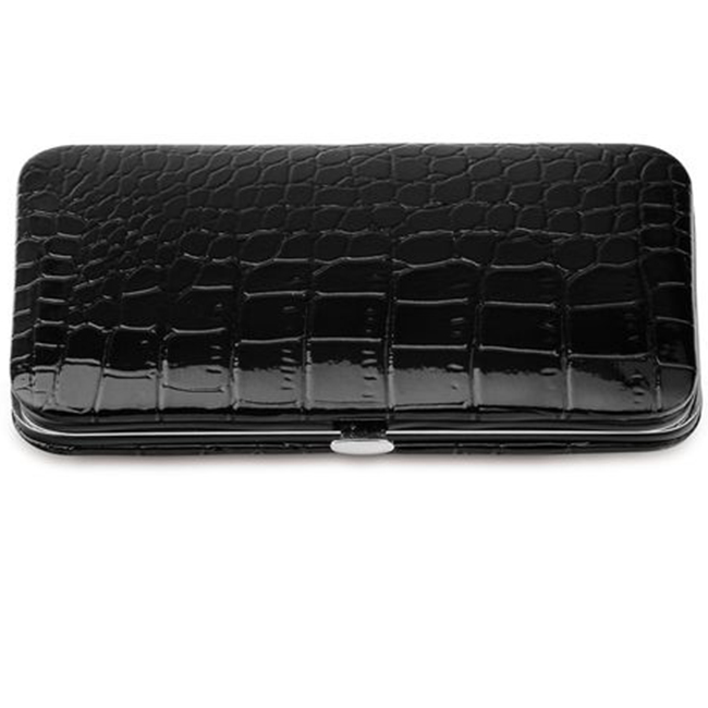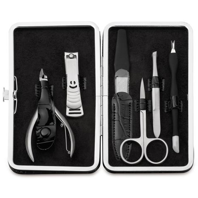 Комплект от шест части за маникюр от стомана с нокторезачка, ножици, пинсети, резачка за кожички, пиличка за нокти, и средство за премахнване на кожички и твърд калъф от изкуствена кожа. Доставя се в подаръчна кутия с размер 160 x 90 x 25 mm