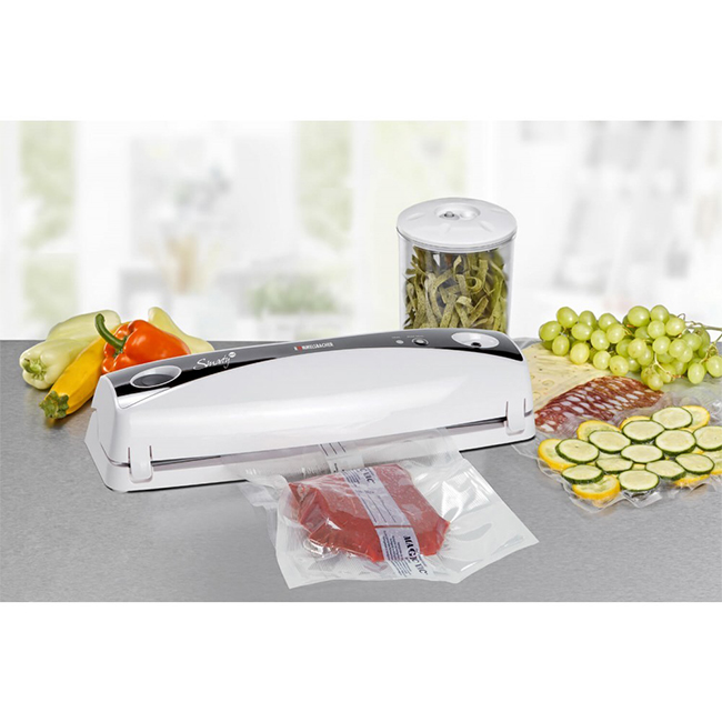 Вакуумирането е икономичен и модерен начин за съхранение на храната. Поставете готовата храна във вакуумна торба или контейнер, стартирайте устройството, изчакайте малко - готово! По този начин можете лесно да запазите вкуса на храната, да запазите нейната свежест и външен вид по-дълго и да я разпределите. Компактния, мощен уред извлича до 97% от въздуха и запечатва специалните вакуумни торбички напълно автоматично. Допълнителната функция MAN SEAL позволява ръчно запечатване на чувствителната храна. Помпата и контролното устройство са интегрирани в капака, защитени от течности, а подвижната долна част е подходяща за съдомиялна машина.