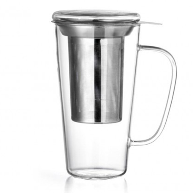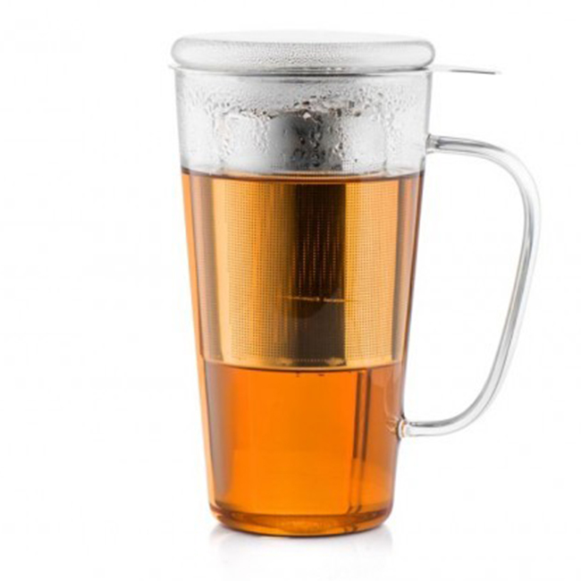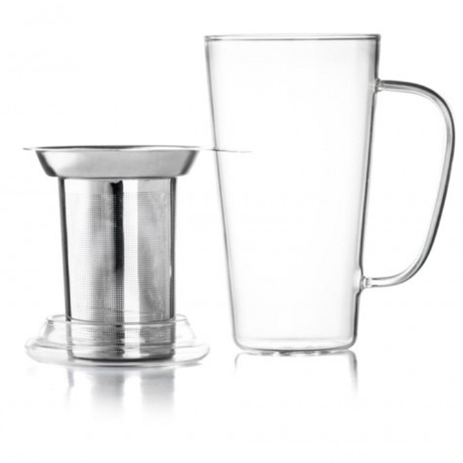 Чаена чаша от боросиликатно стъкло с голям филтър за чай от неръждаема стомана. Стъкленият капак може да служи и като поставка за филтъра.