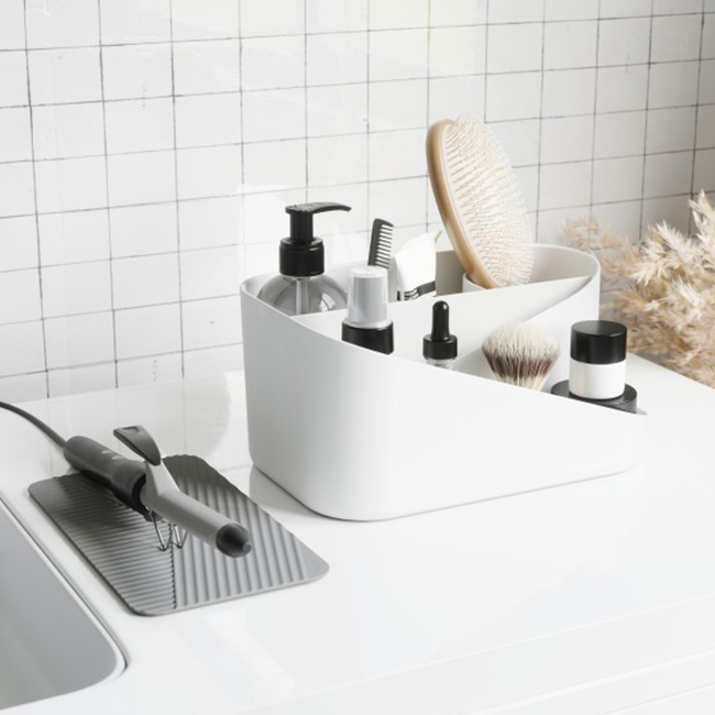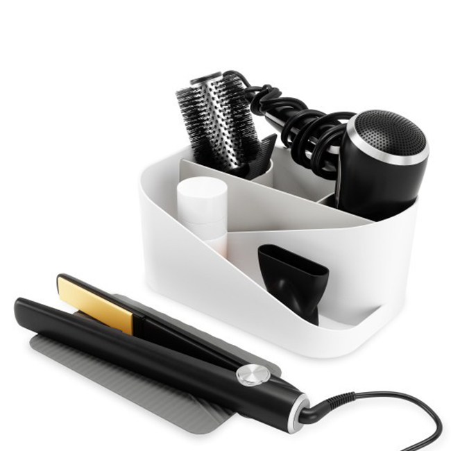 Универсален органайзер за баня, Glam улеснява съхраняването и организирането на всички Ваши продукти и инструменти за коса, включително горещи електроуреди, гребени, щипки и много други. Предлага се с топлоустойчива подложка, която ще предпази повърхностите от топлинни повреди.