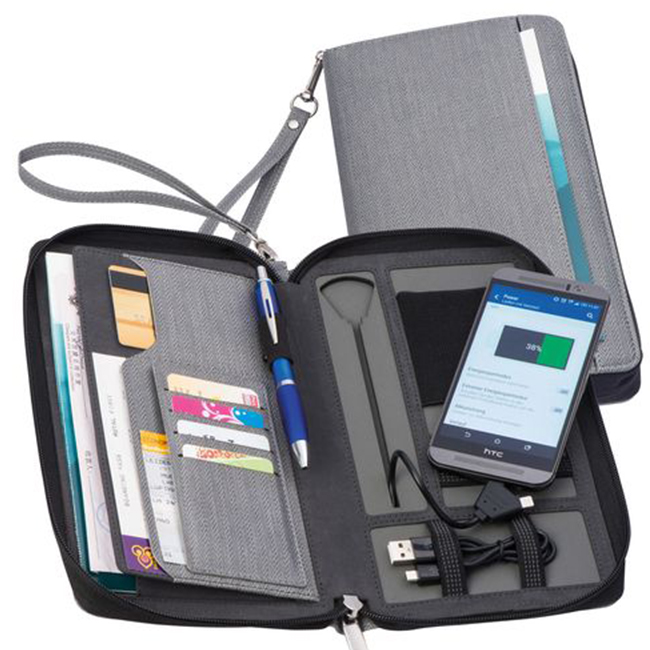 Несесер за документи, включващ преносима батерия (капацитет 4.000 mAH), USB-кабел, 8 джоба, джоб за мобилен телефон, ластик за химикалка и каишка за мобилен телефон.