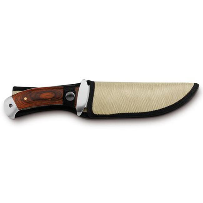 Ловен нож от неръждаема стомана и солидна дървена дръжка, доставен в калъф от полиестер.