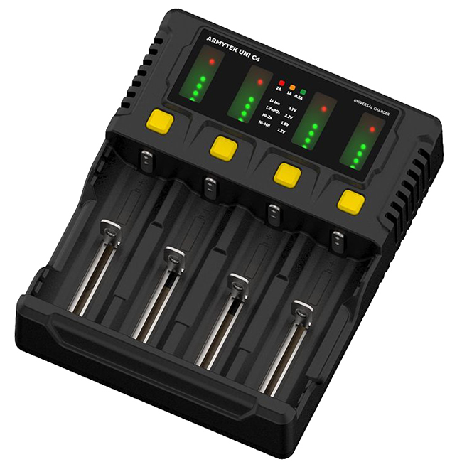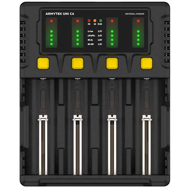Uni C4 е универсално зарядно устройство с интелигентно автоматично откриване на типа батерия, нивото на зареждане и оптималния ток. Едновременно зарежда до 4 батерии от различен тип с ток до 2А. Отделен бутон за всеки канал осигурява лесно ръчно управление. Автомобилен адаптер в комплекта.