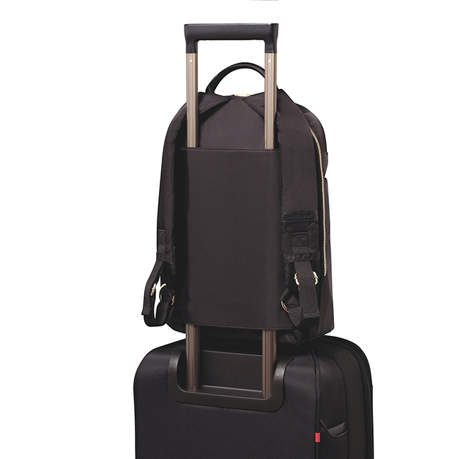 - Задния джоб се разкопчава и позволява закрепването на ръницата към дръжките на куфар с колела