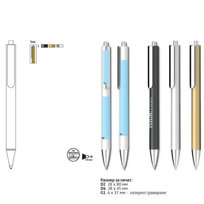 - Автоматична химикалка, пластмасoво тяло в металикови цветове.