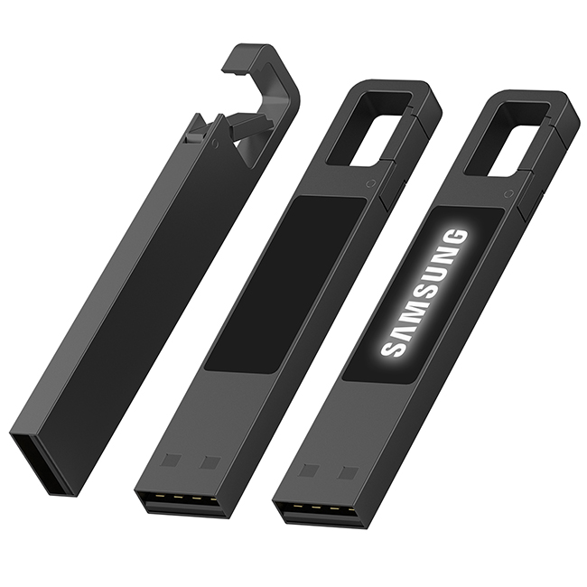 USB памет в модерен металик цвят, със специална LED лампа с бяла светлина, която осветява логото ви след гравиране, когато е включено към компютър. С 64GB вместимост и карабинер за удобно носене.