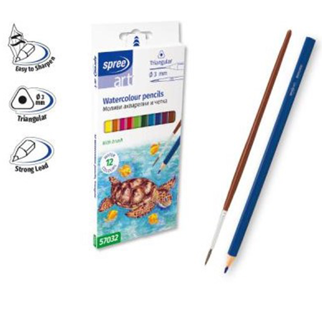 Моливи 12 цв. акварелни, триъгълни, Ø 3 мм графит и четка