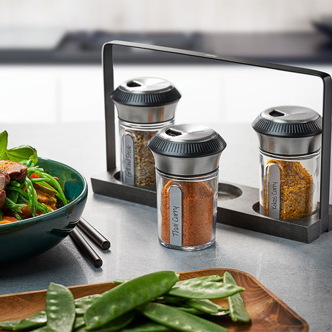 Независимо дали на масата или на кухненския плот, с този висококачествен комплект за подправки или билки сте перфектно оборудвани.Трите бурканчета са от стъкло и с херметически затварящи се капаци.Така се запазват ароматите и предпазват от влага. Въртящият се капак позволява перфектно дозиране - от грубо до фино.Комплектът се допълва от класическа дървена стойка с практична дръжка за носене.Идеалният подарък за любители на кулинарията.