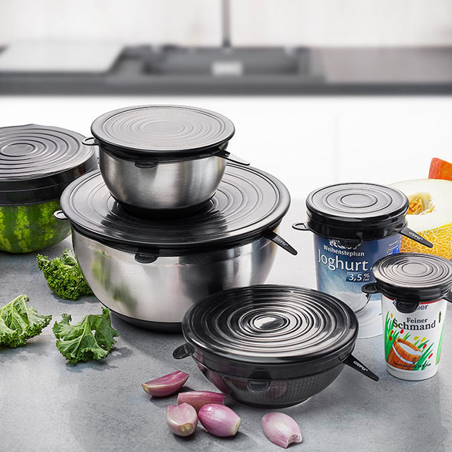 Перфектна свежест без вредни за околната среда пластмасови и алуминиеви фолиа, защото FLEXIFRESH има точния капак за всеки съд.Всеки от многократните, много гъвкави силиконови капаци пасват на различни съдове, буркани или чаши.Затваря ги чисто и херметично.