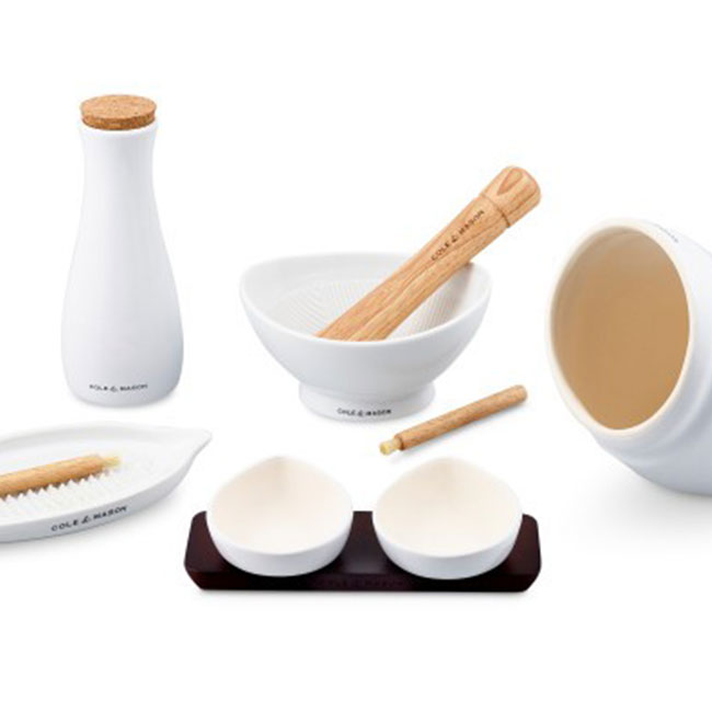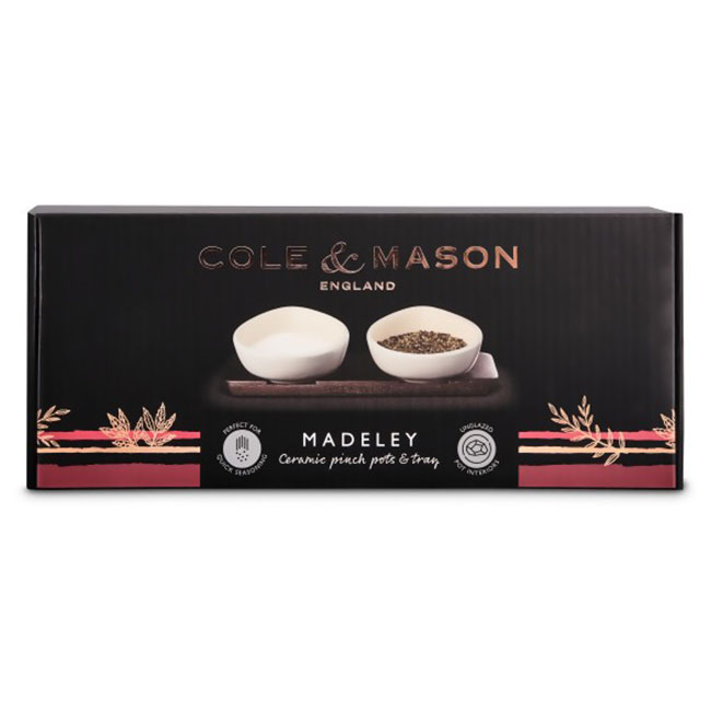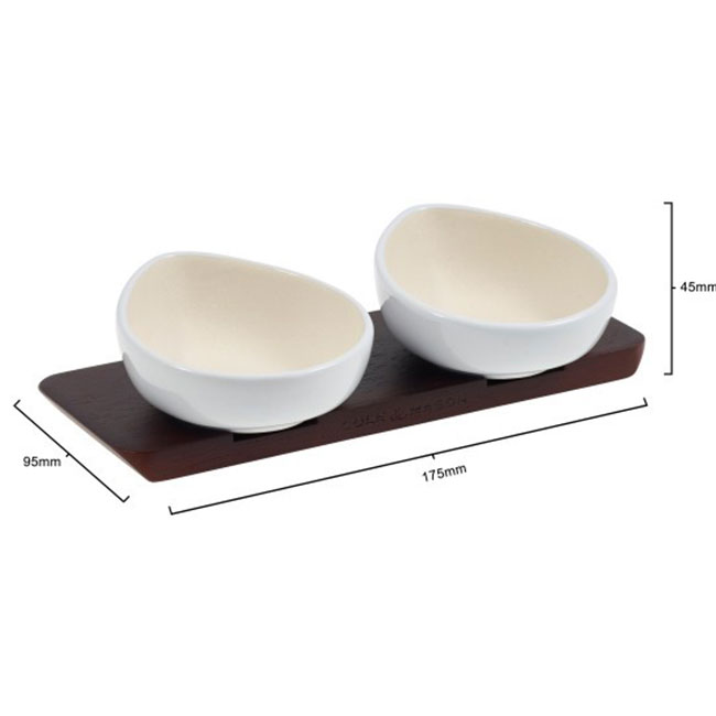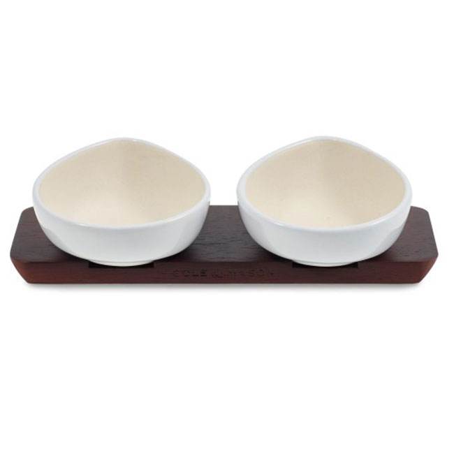 Красиво и елегантно решение за подправки. Състои се от 2 капковидни купички, подредени върху поставка от тъмно дърво. Комплектът за сол и пипер на COLE&MASON оптимизира дизайнерското обещание на Cole & Mason за „кухненски бижута; продукти, които са предназначени да останат на показ, а не скрити в шкафове.” Съдържанието на купичките може да се излее от чучура или да се извади с щипка.