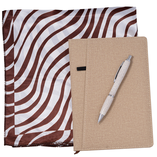 Дамски комплект, съставен от елегантен шал, бележник с твърди корици и рекламна еко химикалка от биоразградим материал с фибри от пшеница и метален клипс. Подаръчната визия се допълва от красивата черна кутия F.Bartholdi.