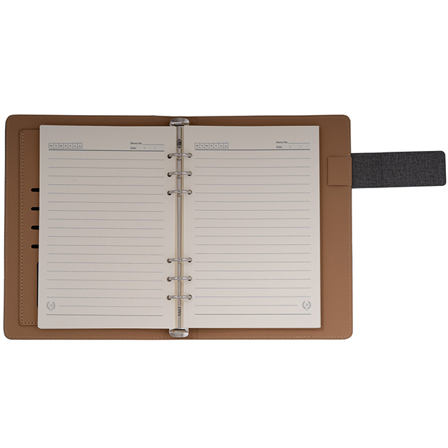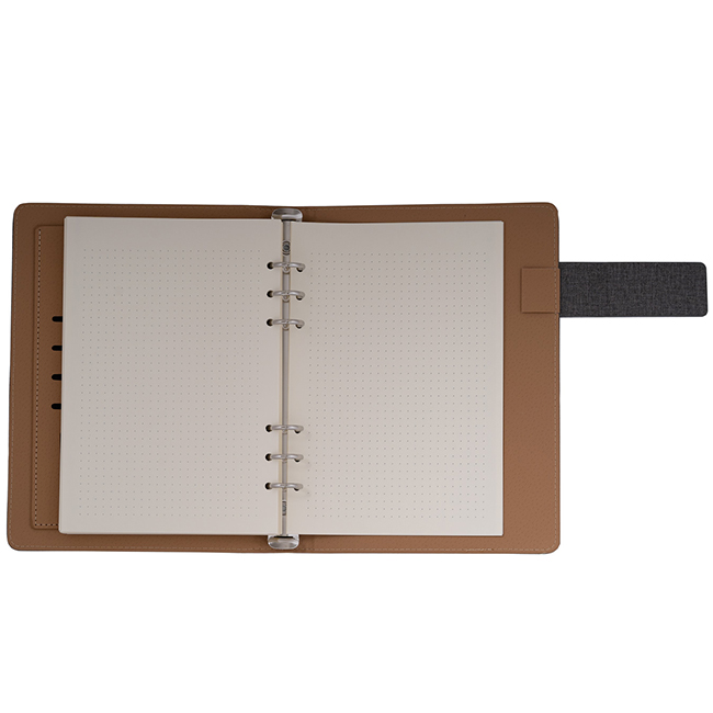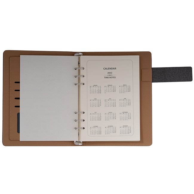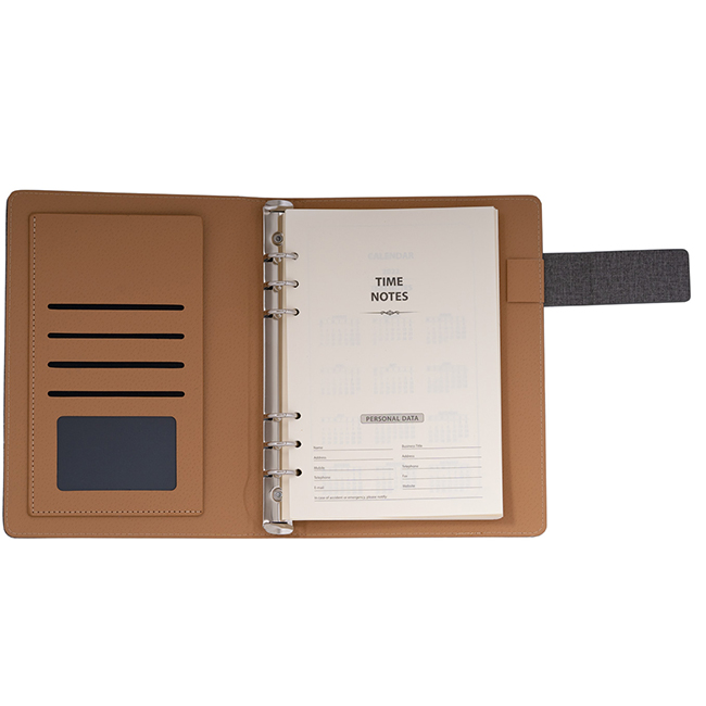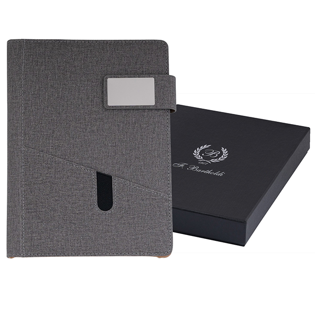 Луксозен бележник - органайзер с твърди текстилни корици, преден и вътрешен джоб за документи, магнитно закопчаване, с метална плочка за гравиране. Съдържа календар за 2022-2024 г. и 200 броя тонирани страници на редове и точки. В красива подаръчна кутия F.Bartholdi.