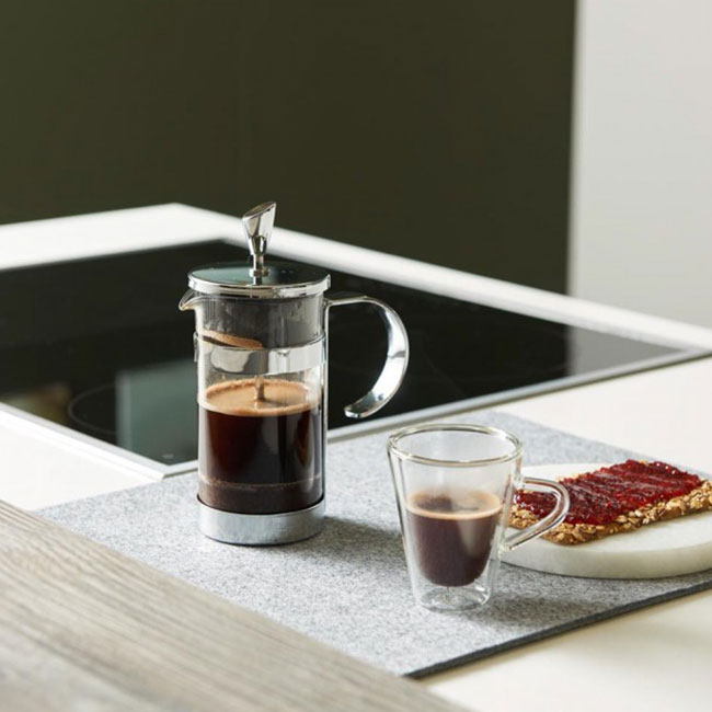 Добавете смляното кафе, залейте го с гореща вода, изчакайте няколко минути, след това натиснете бавно пресата надолу и се насладете на вкусното и ароматно кафе. Пресата е изработена от стъкло и полирана неръждаема стомана. Стъклото може лесно да се извади и да се мие в съдомиялна машина.