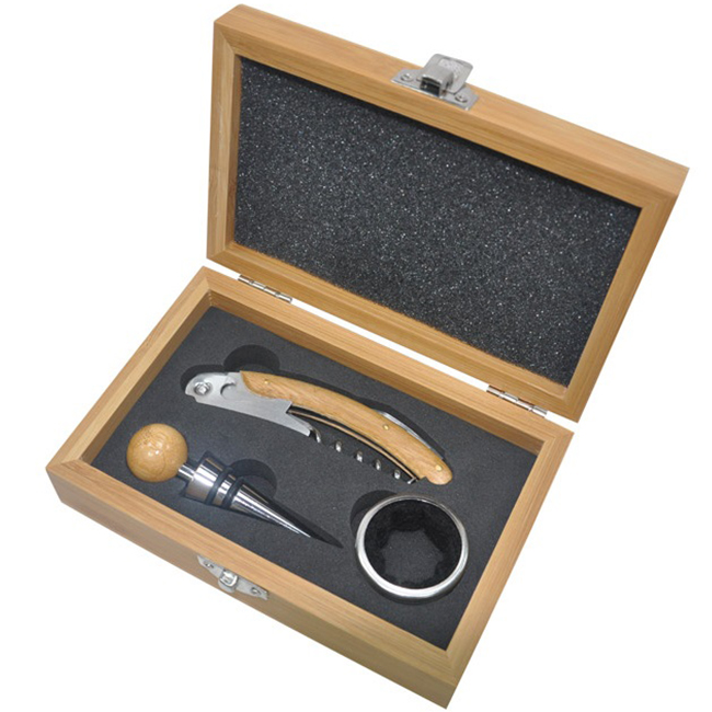 - Дървена кутия с тирбушон, ринг за бутилка и тапа