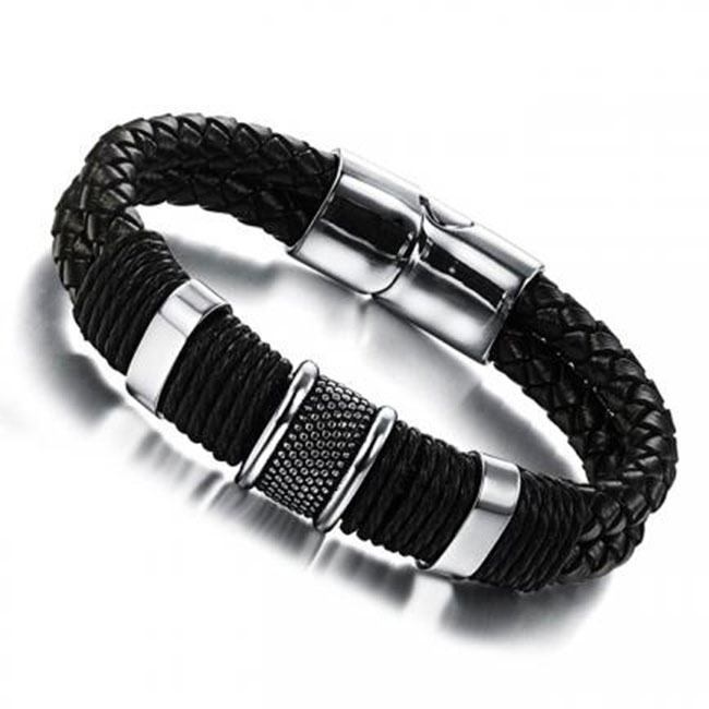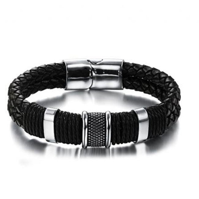 Мъжка кожена гривна с плочка - L размер SILVER FLAME