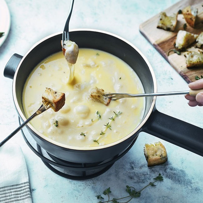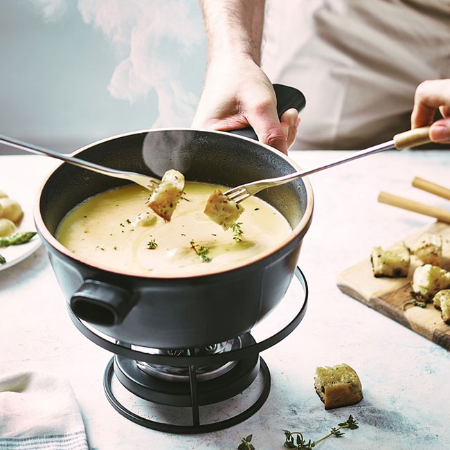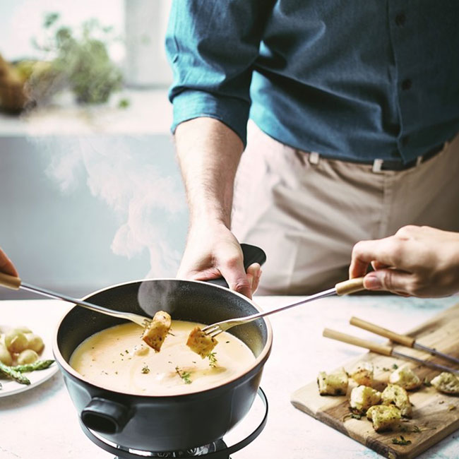 Комплектът за фондю „Delight“ ви позволява да приготвите вкусни фондюта със сирене или шоколад на всички видове източници на топлина, включително индукционни.