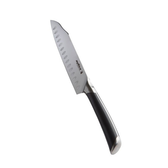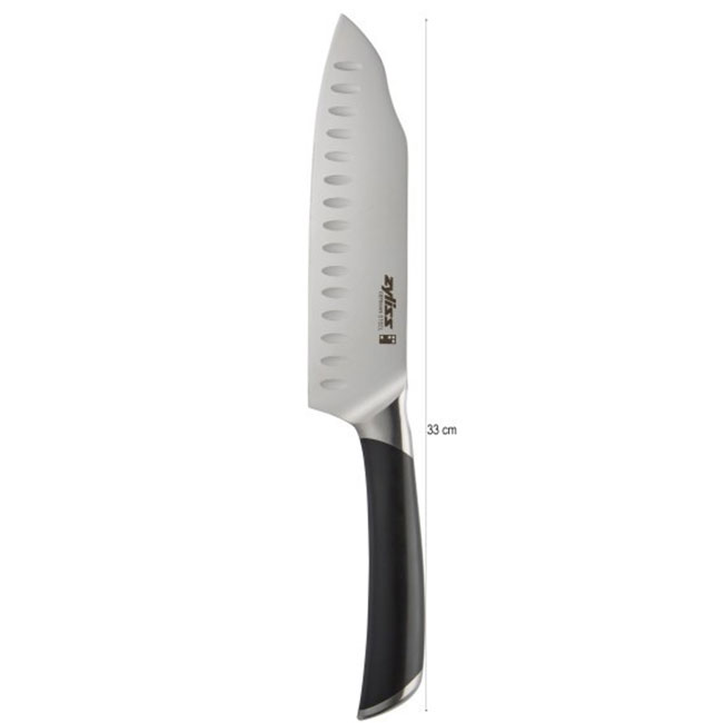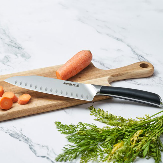 Ножът Santoku е японската версия на нож на майстора. Той е идеален за нарязване на зеленчуци, а широкото острие работи добре за загребване на нарязана храна от дъската. Santoku може да се използва и за нарязване на месо и има тесен гръб за правене на тънки филийки. Широкото острие може да се използва за загребване и пренасянето на нарязани на кубчета зеленчуци или други съставки в тенджера или купа, а също така е добро за смачкване на чесън. Какъвто и да е вашият стил на рязане, Zyliss Comfort Santoku ще се справи добре с всички техники.