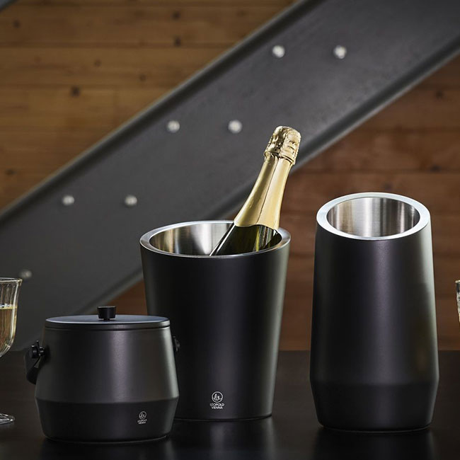 Бар колекцията е модерна, уникална и специално проектирана за LEOPOLD VIENNA! Този охладител за бутилки с асиметричен ръб е допълнение към всяка маса. Охладителят за бутилки също е функционален, тъй като поддържа бутилките на хладно за по-дълго. Охладителят е изработен от неръждаема стомана с двойни стени и има матово черно покритие.