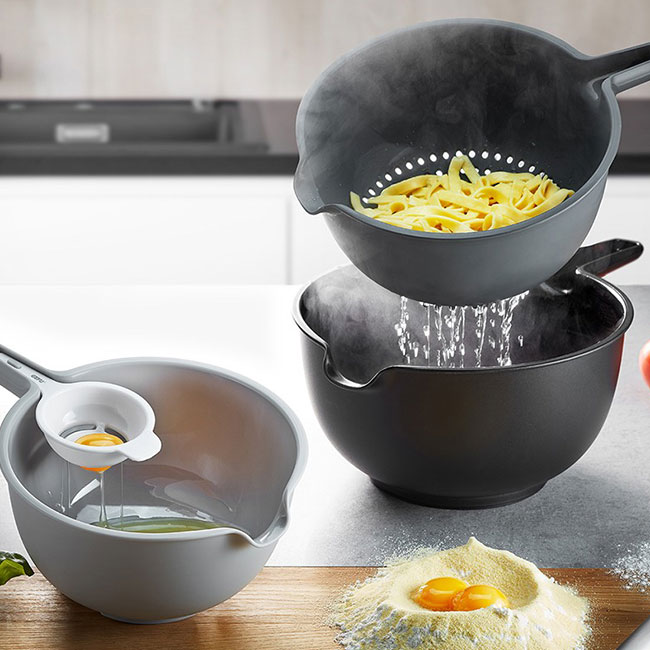 Този практичен сет от 4 части спестява място в кухненския шкаф и е необходим помощник във всяка кухня. Всички части от комплекта се прибират една в друга, така спестяват място и стоят добре подредени.