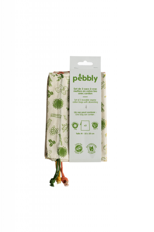 Всички многократни торби на Pebbly са изработени от органичен памук.