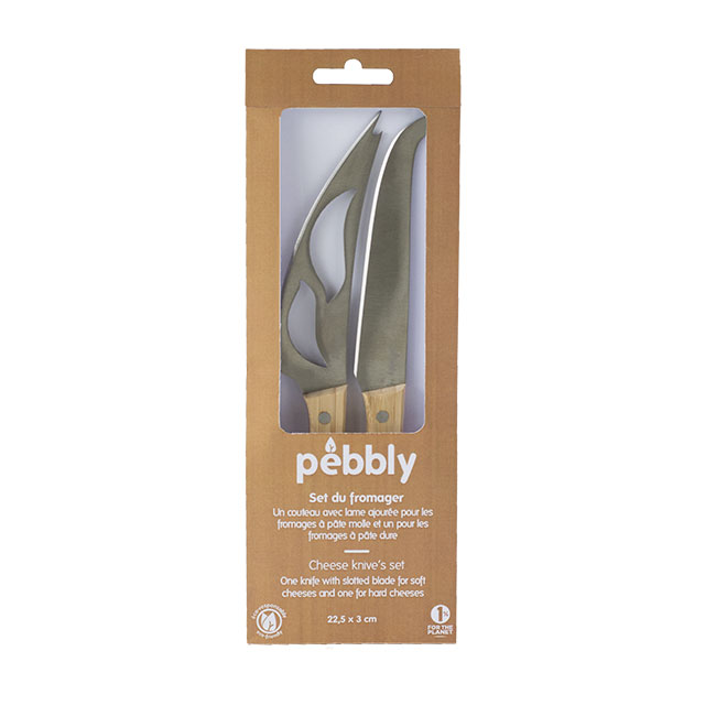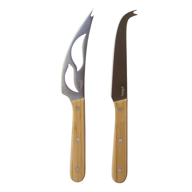 Комплектът за сирене включва 2 ножа за сирене от неръждаема стомана с бамбукови дръжки.