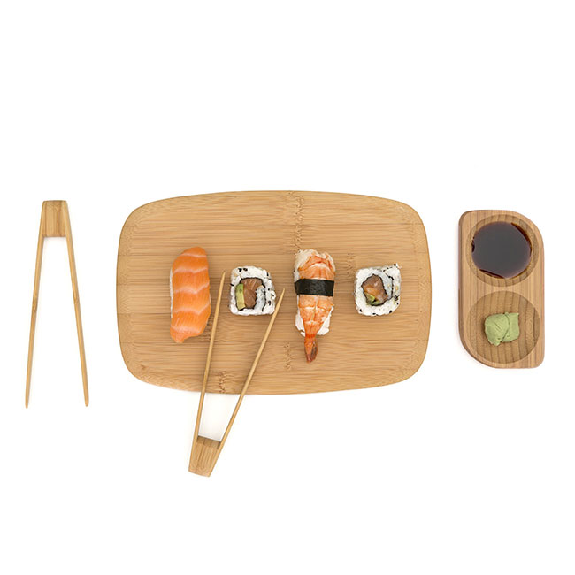 Този комплект се състои от 2 щипки за суши и двойна купичка. Тя е идеална за соев сос, джинджифил и уасаби.