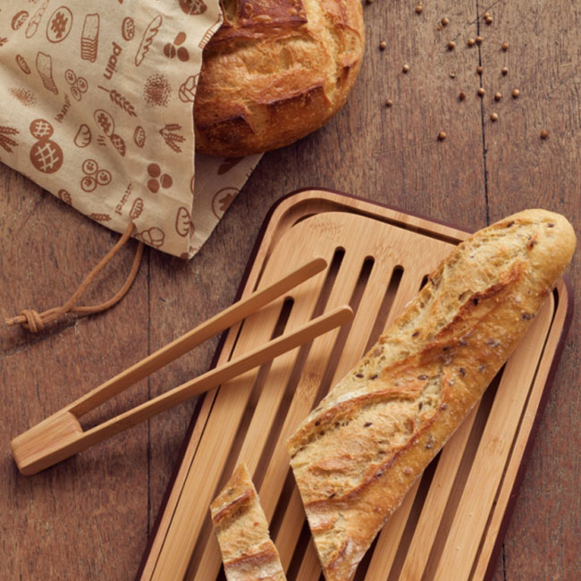 Дъската от комплекта за хляб има кантове в шоколадов цвят. Този много модерен нюанс ще внесе топла и елегантна нотка на Вашите маса или работен плот. Изключително практична, има прорез за по-лесно повдигане на решетката за събиране на трохите. Щипките за тост са направени от естествен бамбук, така че можете лесно да вземете тоста си от тостера, без да изгорите пръстите си. Торбата за хляб от органичен памук е идеална за носене и съхранение на хляб за по-дълго.