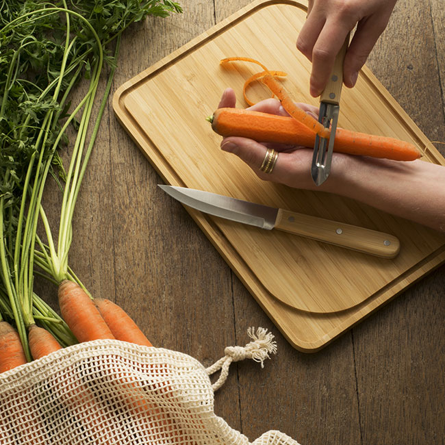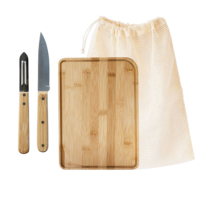 - Комплект за готвачи - дъска, нож, белачка и торбичка за зеленчуци