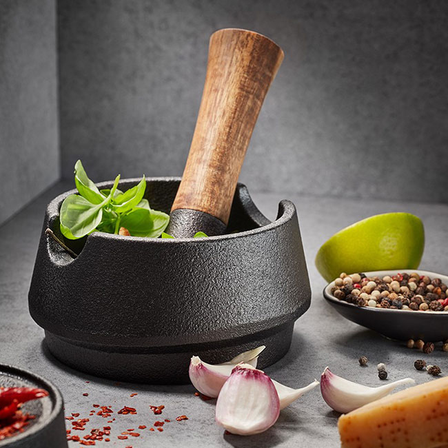 Чугунено хаванче с чугунено чукало с дървена дръжка от акациево дърво. Големият му размер (11,5 см. в диаметър) и грапавата му вътрешност улесняват значително смилането на различни билки, подправки и др.