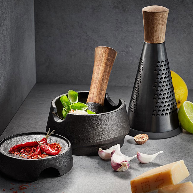 Елегантен комплект за всеки любител или професионален готвач. Включва чугунено хаванче с чугунен капак, който може да се използва като второ хаванче, чугунено чукало с дървена дръжка от акациево дърво и конусовидно двустранно ренде от неръждаема стомана и дръжка от акациево дърво. Стоманеното ренде разполага с противоплъзгаща се основа и е заточено с “DIAMOND LASER CUT“ технология, която гарантира острота и надеждност.