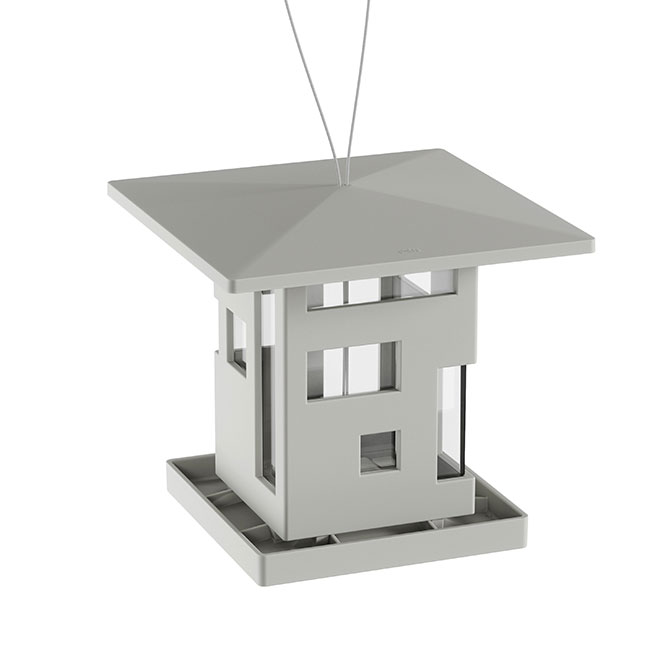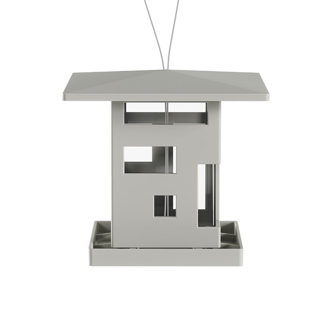 Хранилката за птици BIRD CAFE от UMBRA е с форма на куб с асиметрични прозорци.