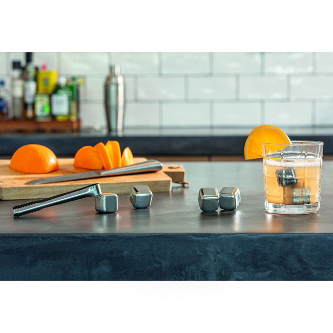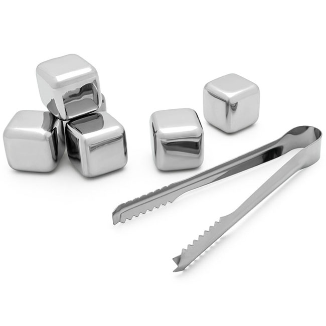 Сет стоманени охладители за напитки, с които да охлаждате напитките си, без да ги разреждате. Опаковани по шест в удобна кутия, с включена щипка за поставяне на кубчетата в чашата.