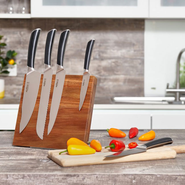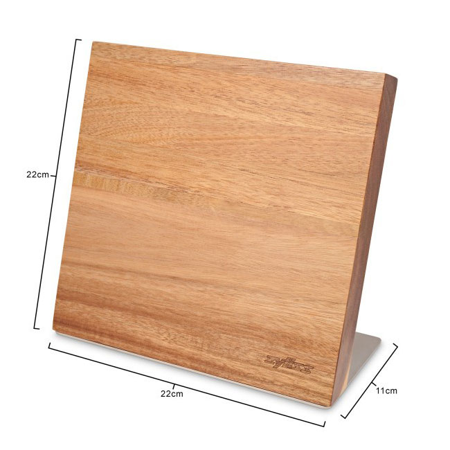 Стилно допълнение към всяка кухня, блокът от акациево дърво е интелигентният, устойчив избор за всяка кухня. Изключително издръжлива, акацията е много плътна дървесина с привлекателна, разнообразна текстура, която е богата на естествени масла, които ѝ помагат да остане здрава във времето. Просто избършете с влажна кърпа, за да останете чисти. Ножовете не са включени.