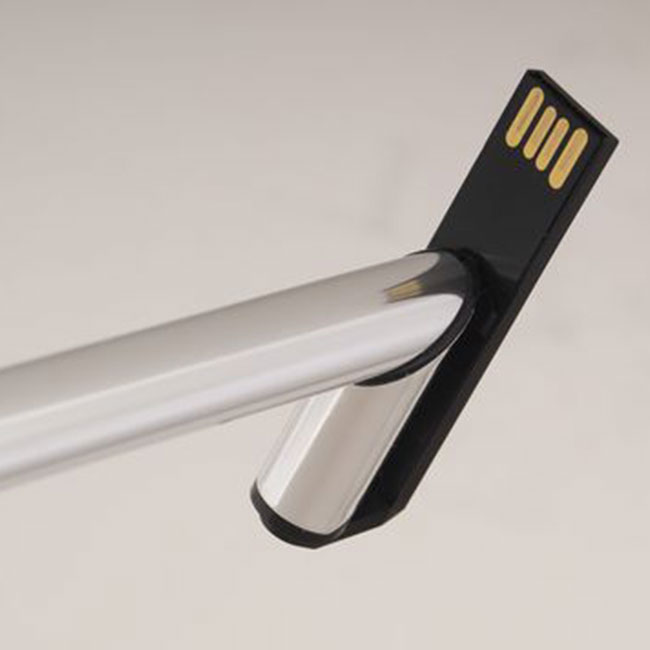 Стилна метална химикалка с вградена преносима памет 16 GB  без кутия. USB-то е скрито под клипа и се показва чрез завъртане на горната част. Тялото на химикалката е подходящо за лазерно гравиране, а върху клипа може да се брандира с цветен печат. Химикалката е .