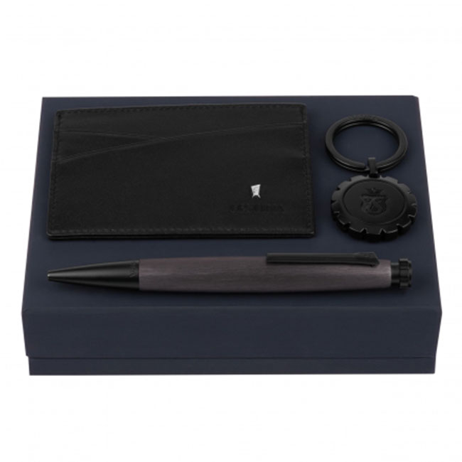 Луксозен комплект съдържащ метален ключодържател, визитник от естествена кожа и стилна химикалка с металик покритие. В красива подаръчна кутия.