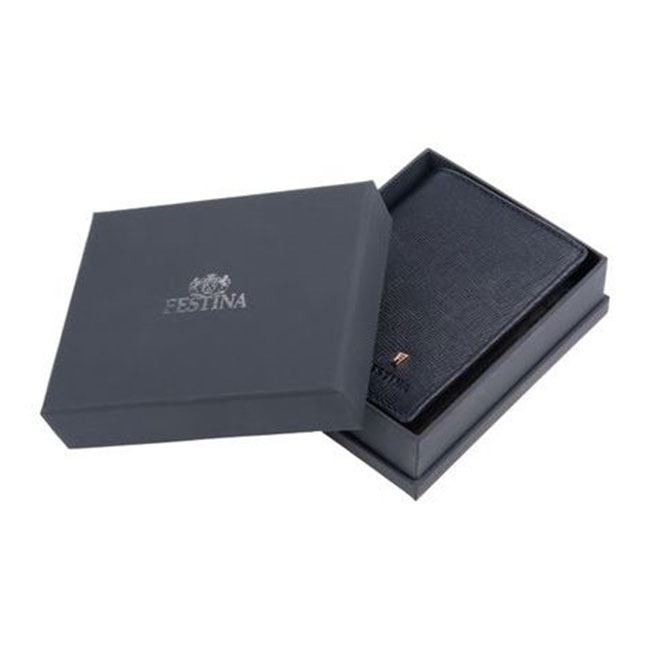 Линията кожени изделия "Chronobike" е изработена от внимателно подбрана естествена кожа със сафиано текстура, против зацапване. Тази тъмносиня версия е украсена с емблематичния подпис на логото F във формата на трапец, в златисто-розов цвят. Подчертава се от релефното в кожата име Festina. Тази поставка за карти е минималистична, компактна и много практична, с множество слотове за карти и две отделения за банкноти отгоре. Всички артикули на Festina са оборудвани със защитна RFID подплата.