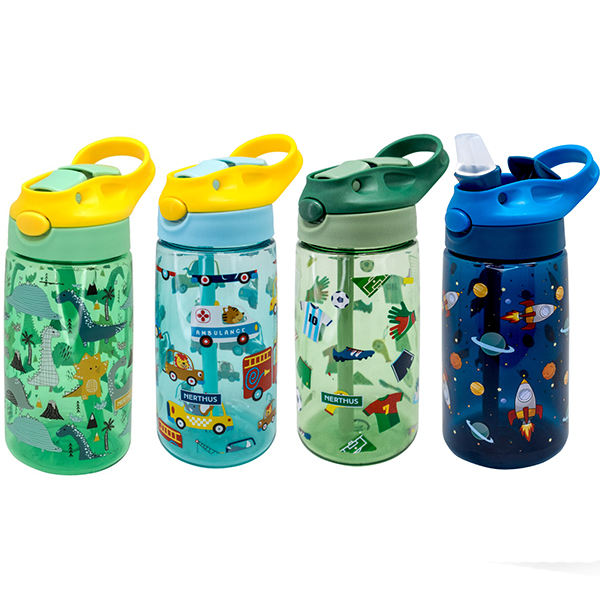 Системата за пиене със сламка за многократна употреба гарантира консумирането на вода, сок и други, без разливане. Веселият и цветен дизайн забавлява децата – бутилката се предлага в различни дизайни.