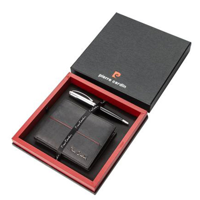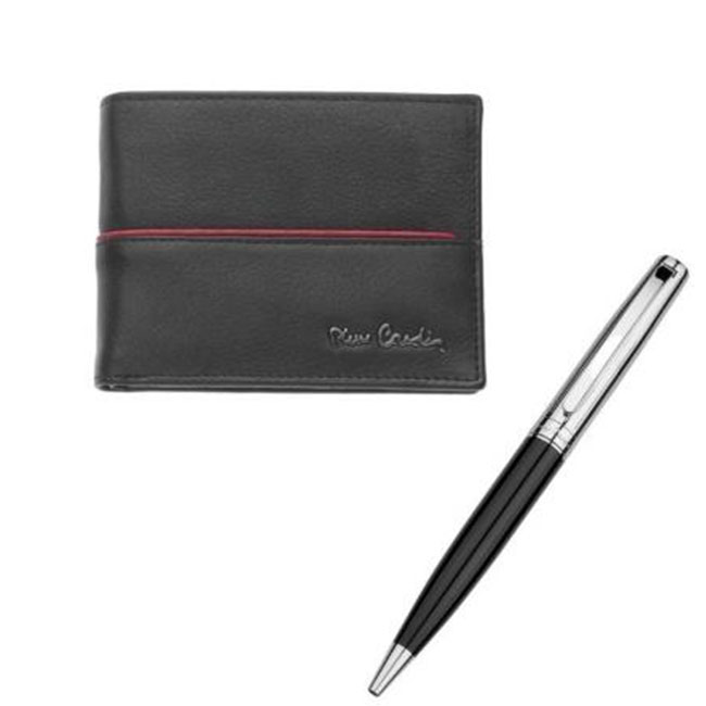 - Луксозен комплект, който съдържа портфейл и химикал, съчетани със стилна кутия Pierre Cardin. Портфейлът е изработен от естествена кожа.